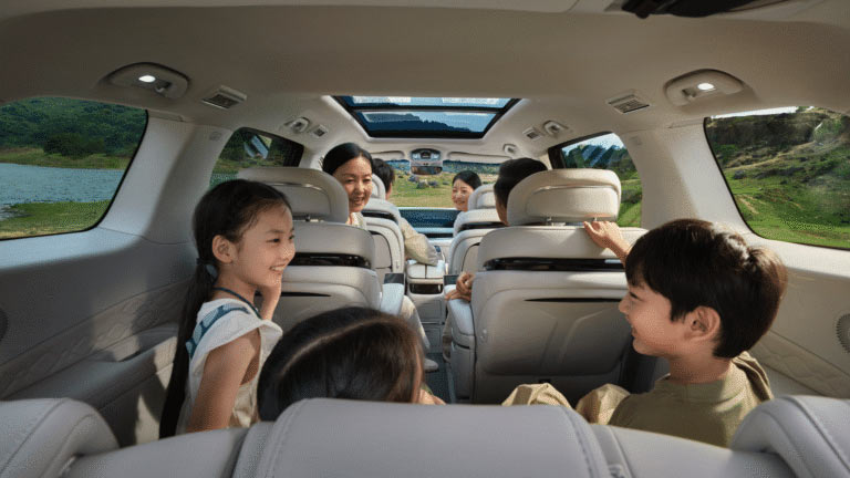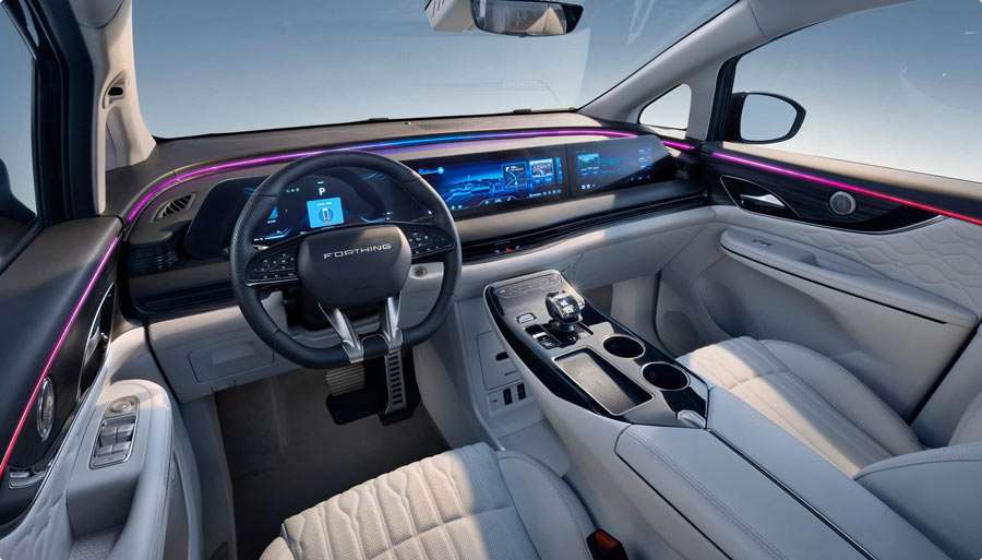 Lo primero que impresiona de la Forthing V9 es su porte. Con 5,25 metros de largo, su diseño exterior es moderno y disruptivo, pero es en el interior donde ocurre la magia. Está configurada para 7 pasajeros (2+2+3), donde la segunda fila es la verdadera protagonista.